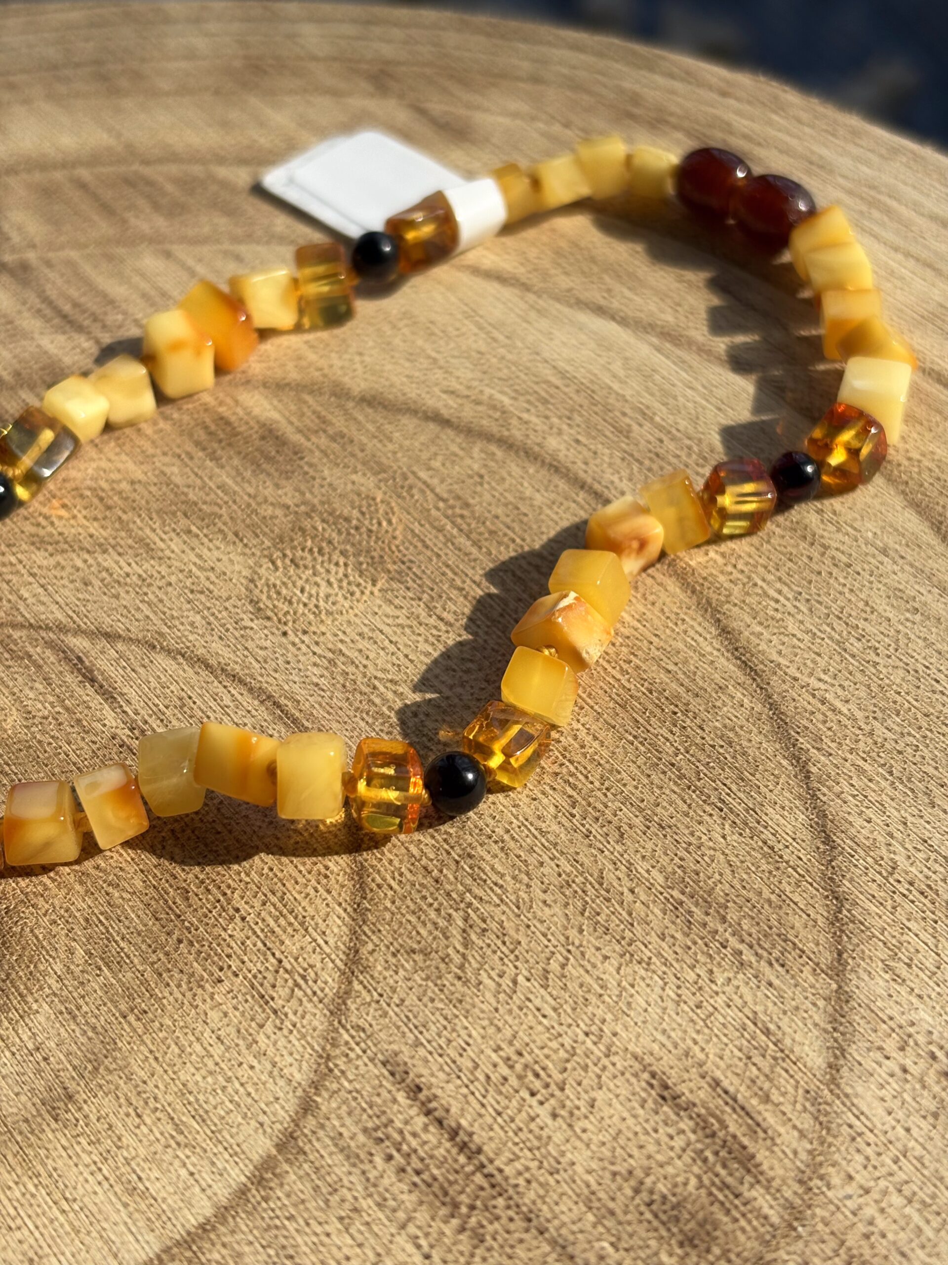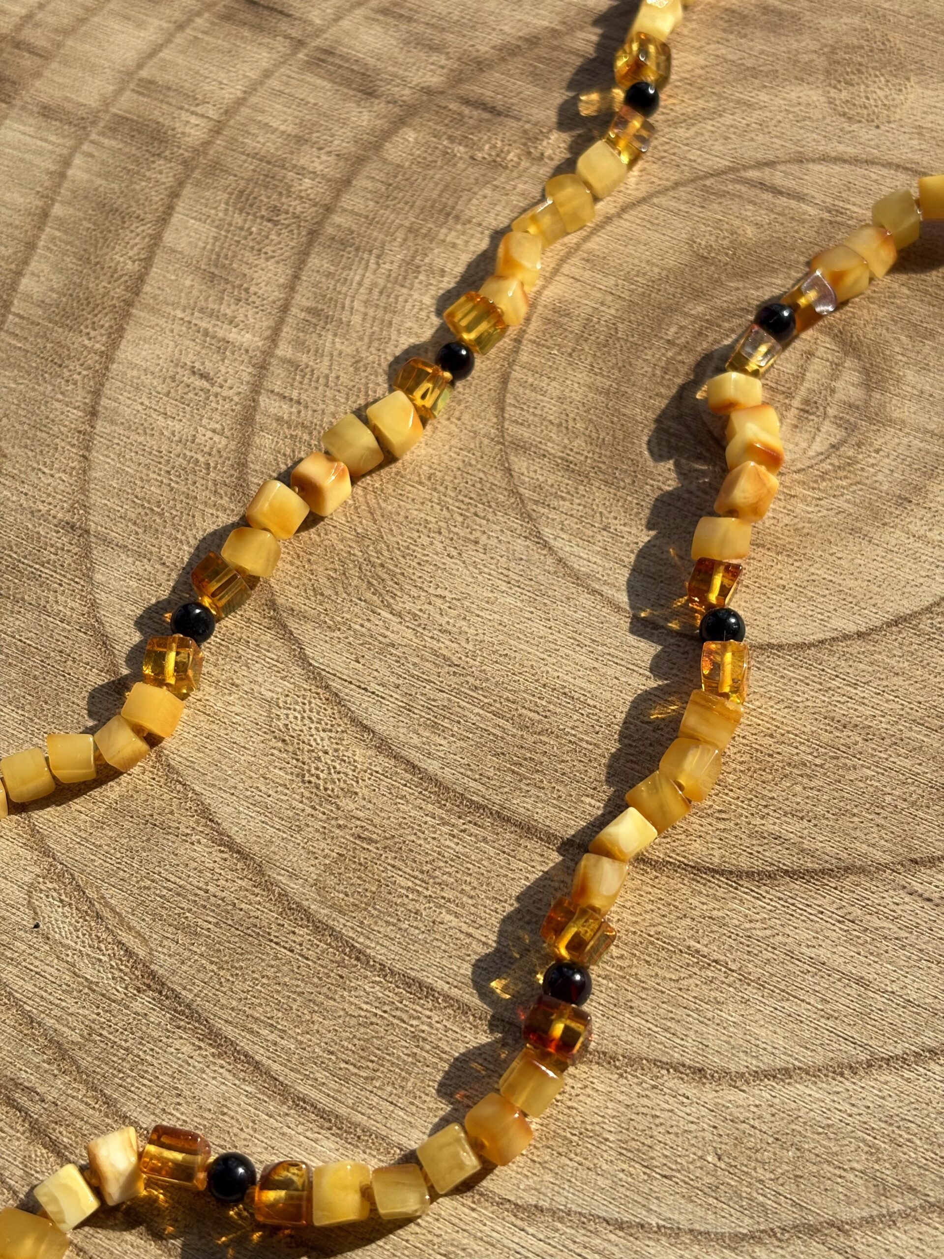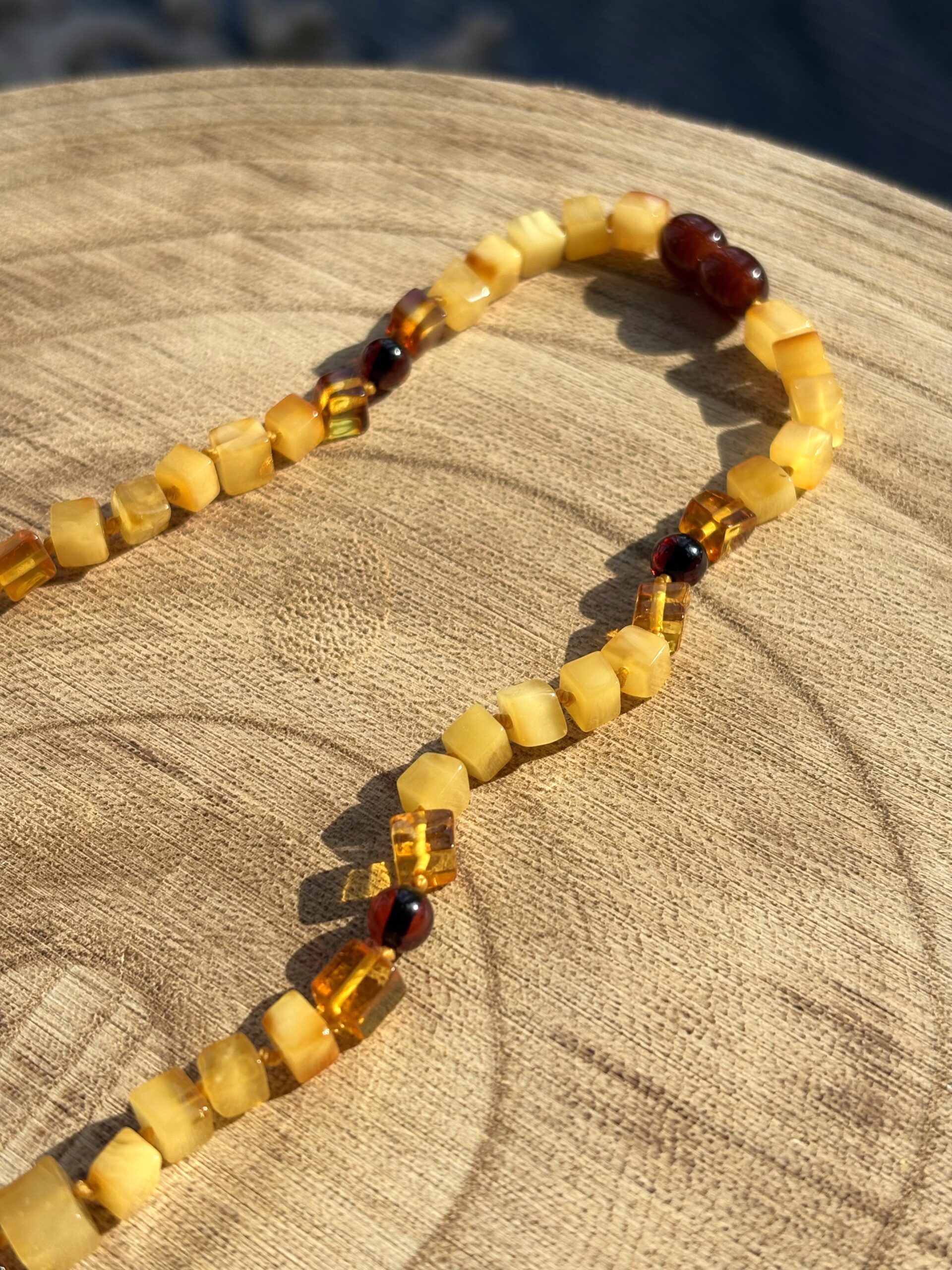 Kto powiedział, że korale z bursztynu muszą być nudne? Przedstawiamy projekt, który łączy tradycję Bałtyku z nowoczesnym designem. Naszyjnik składa się z ręcznie szlifowanych kostek naturalnego bursztynu w dwóch kontrastujących kolorach: ciepłym cytrynowym, mlecznym i białym oraz głębokiej wiśni w kształcie kulek.