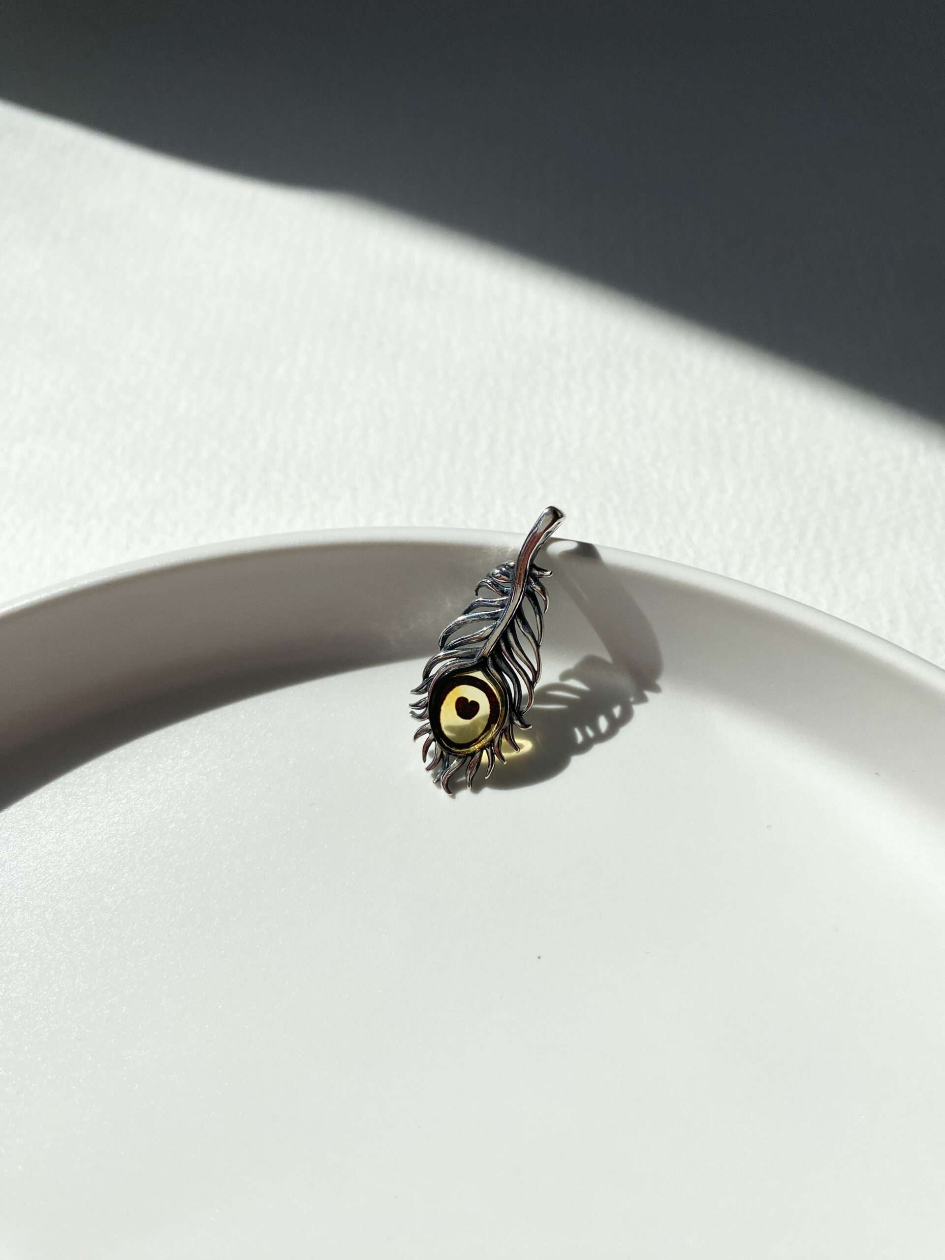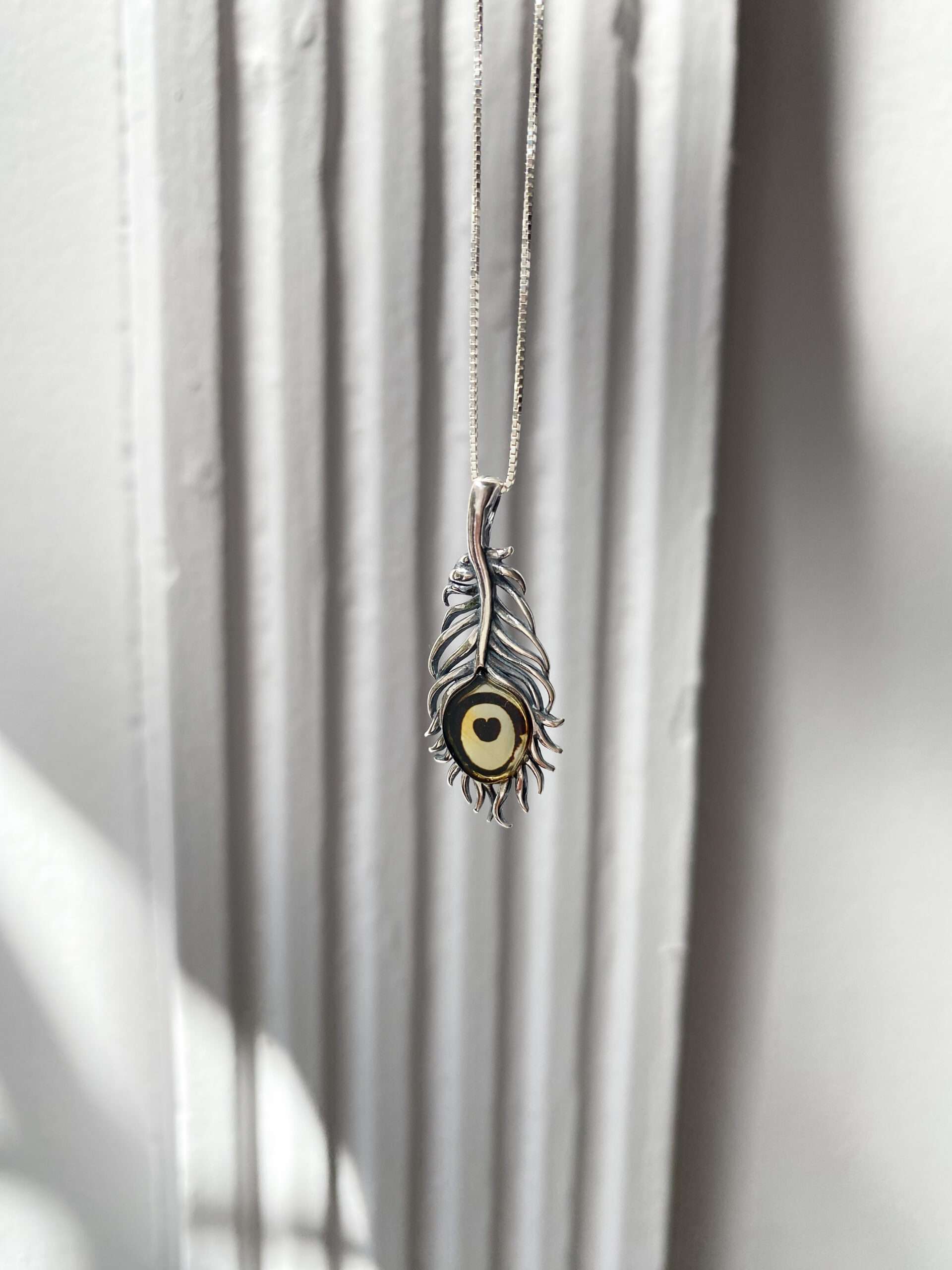 Naszyjnik, który doda Twojej stylizacji lekkości i oryginalności. Bursztyn Pawie Oczko, symbol mądrości i intuicji, w połączeniu z kształtem pióra tworzy wyjątkową kompozycję.
