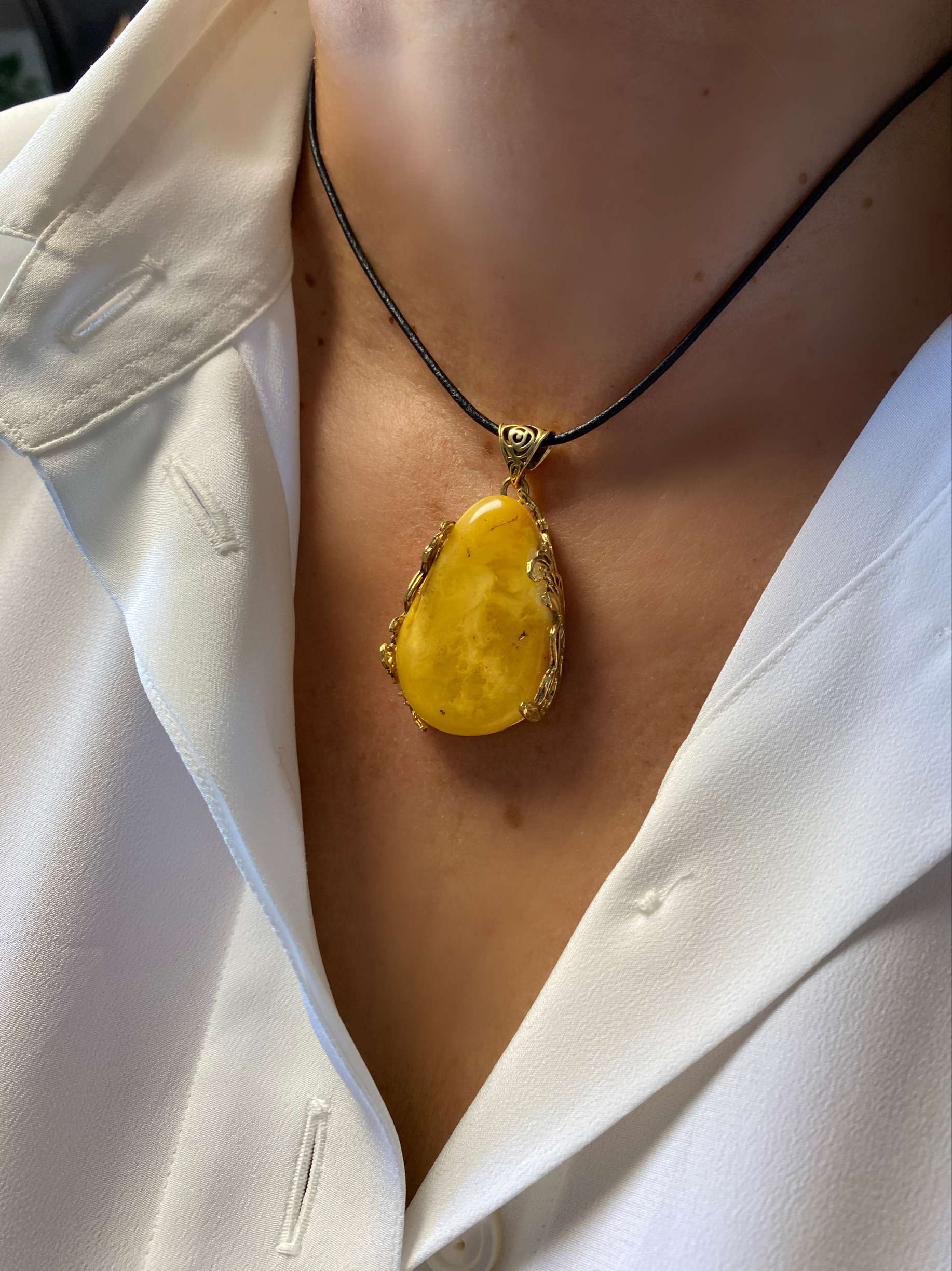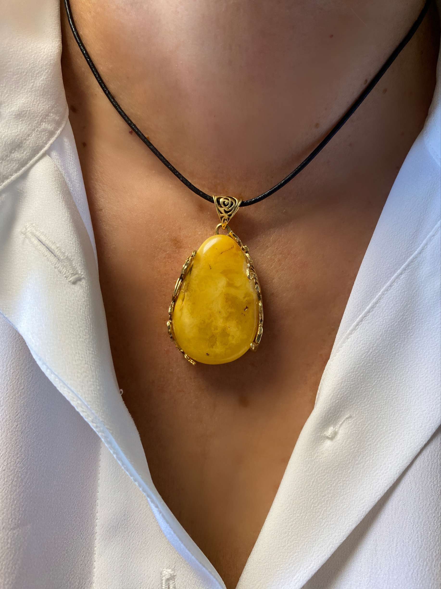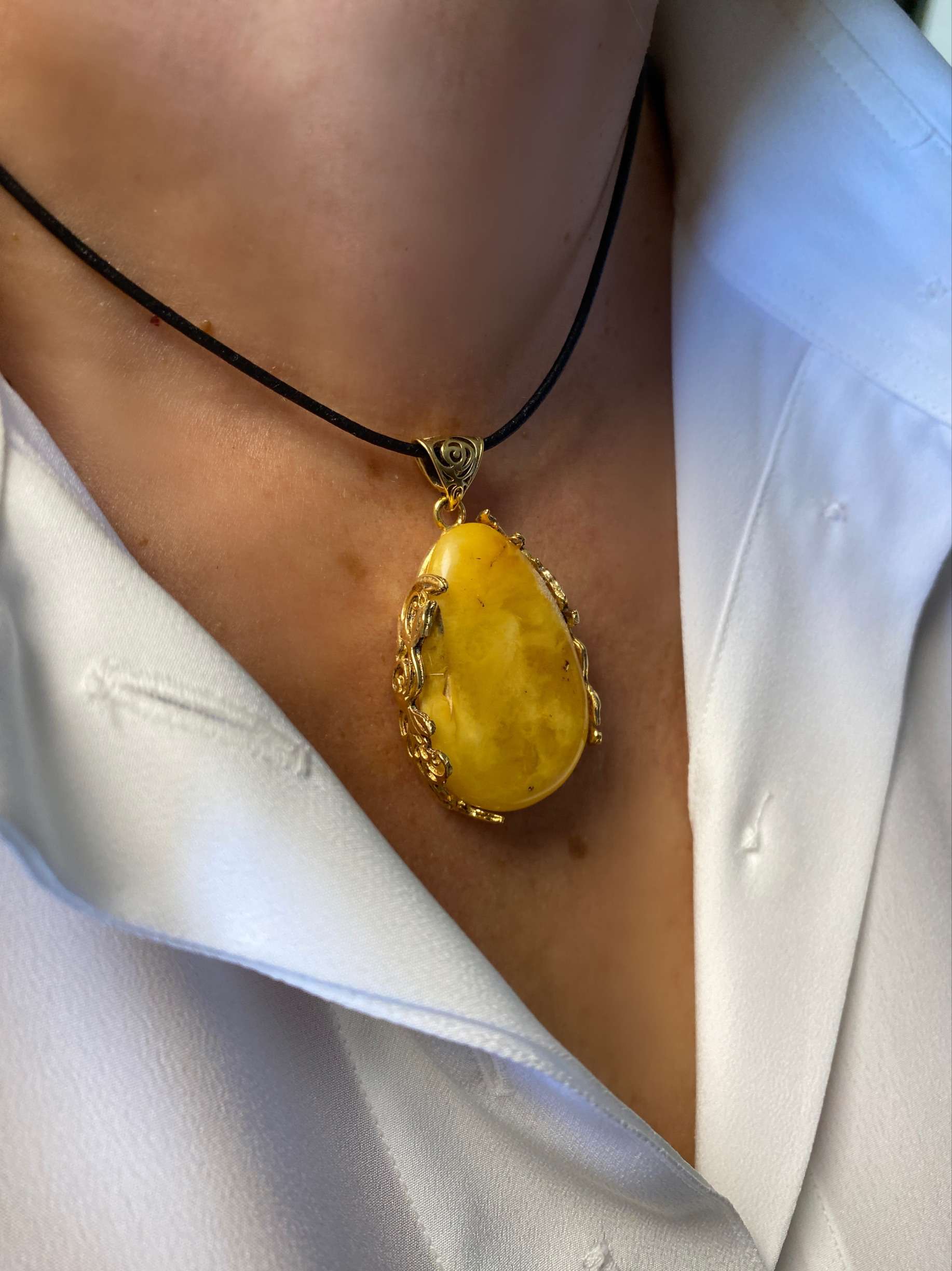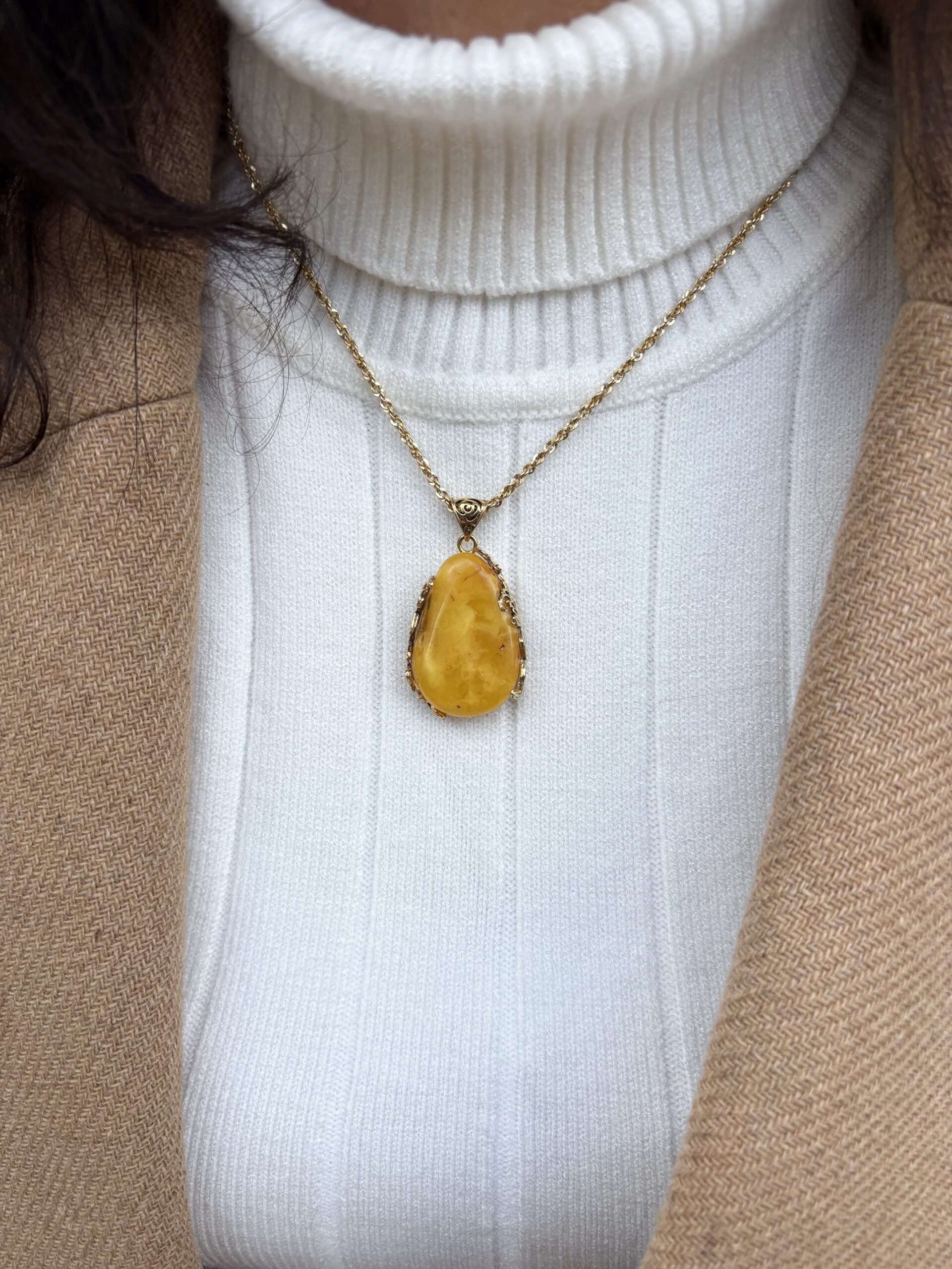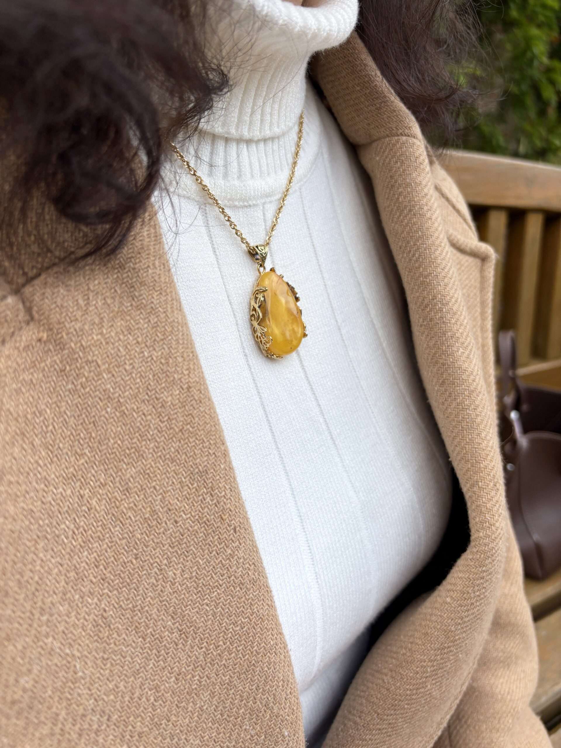 Oprawa naszyjnika jest równie piękna co sam bursztyn. Ten niezwykły kamień szlachetny, o delikatnym, mlecznym zabarwieniu, został osadzony w kunsztownej oprawie, godnej królewskich salonów.