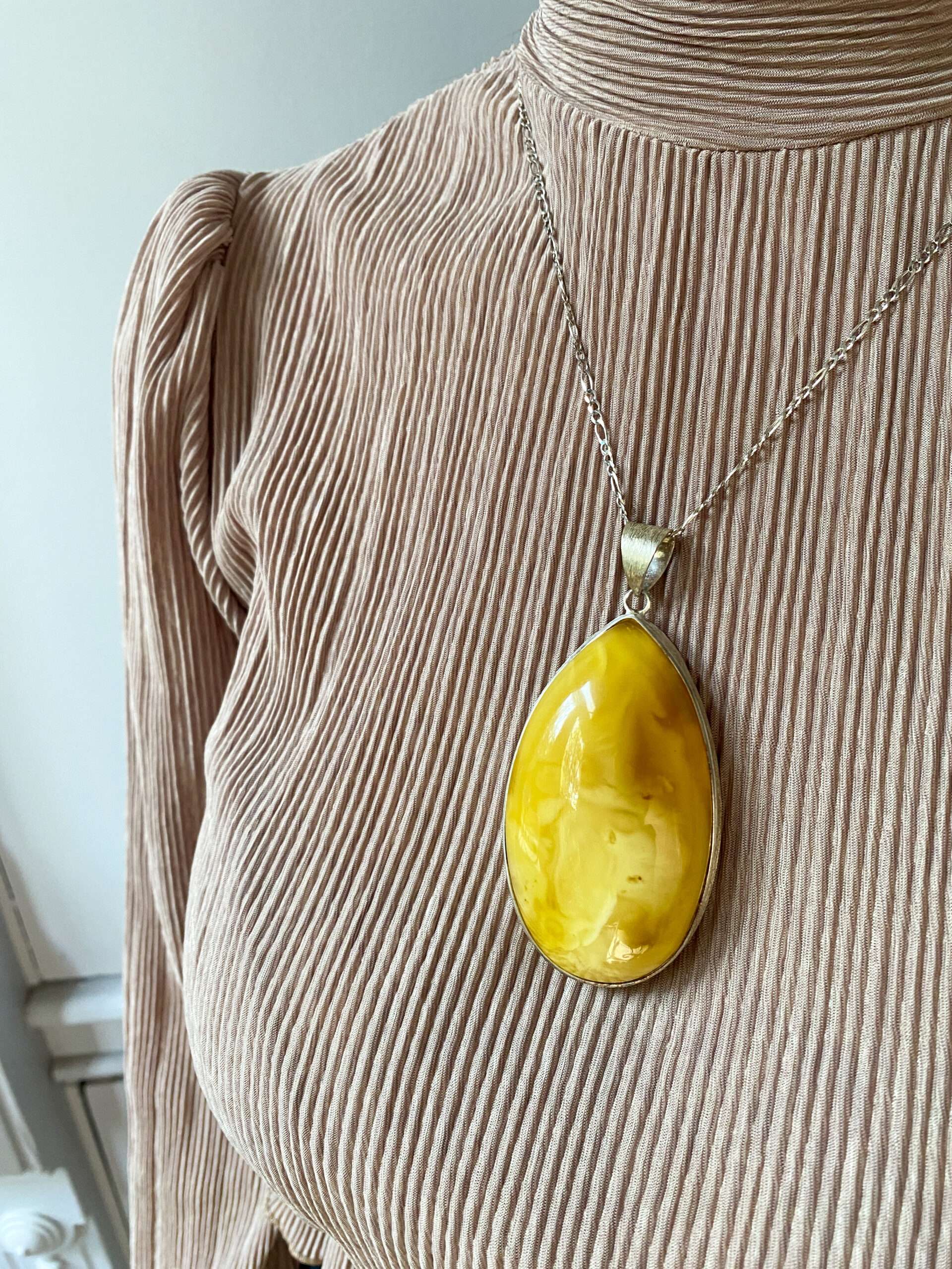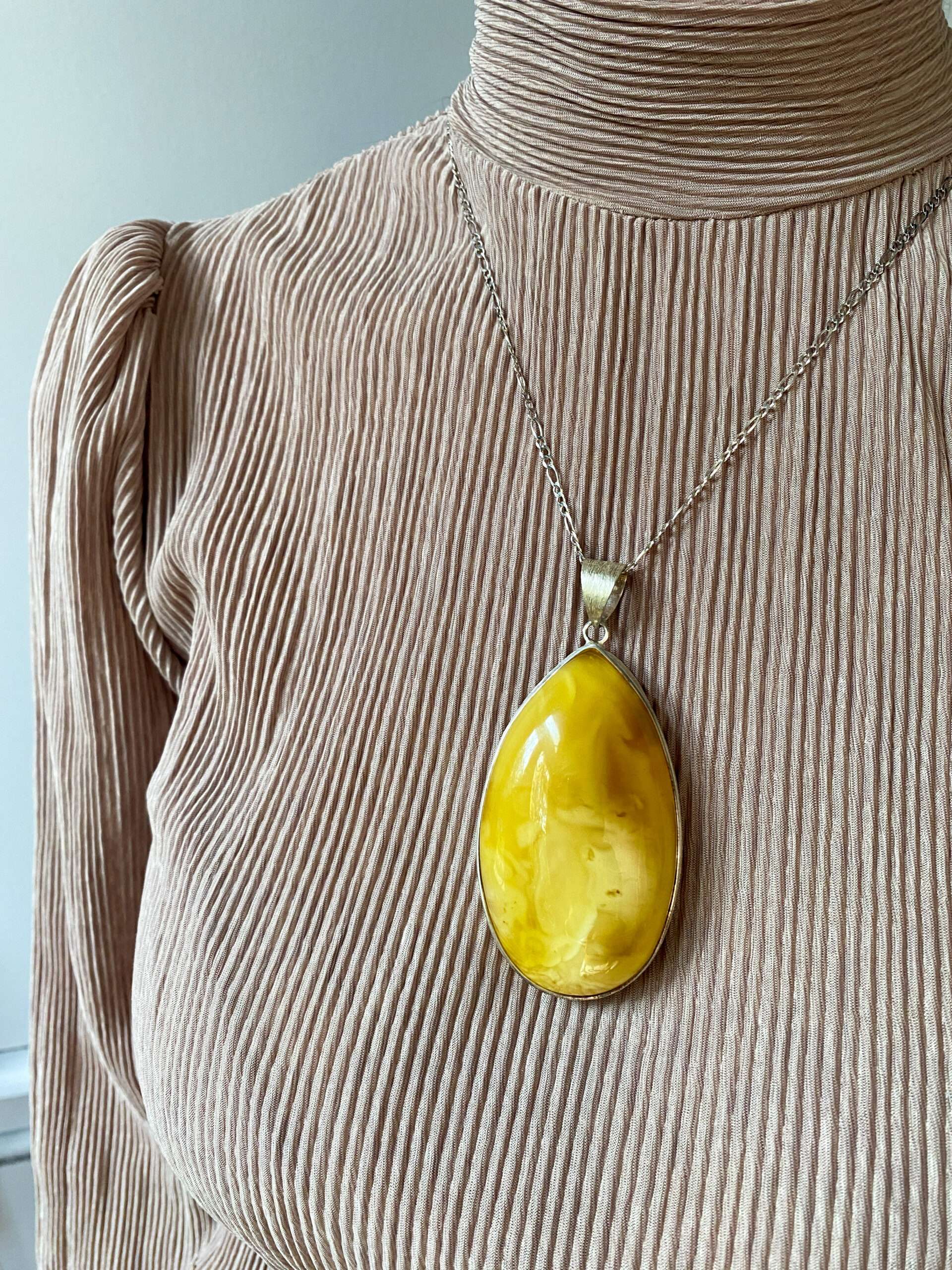 Bursztyn mleczny jest starannie osadzony w srebrnym oprawieniu, które podkreśla jego unikalny kolor i wyjątkowość. Wykończenie srebra dodaje zawieszce luksusowego wyglądu, jednocześnie podkreślając delikatność bursztynu. Duża zawieszka jest mocowana na wytrzymałej srebrnej zawieszce, która jest dostatecznie długa, aby idealnie wyeksponować tę imponującą biżuterię na szyi.