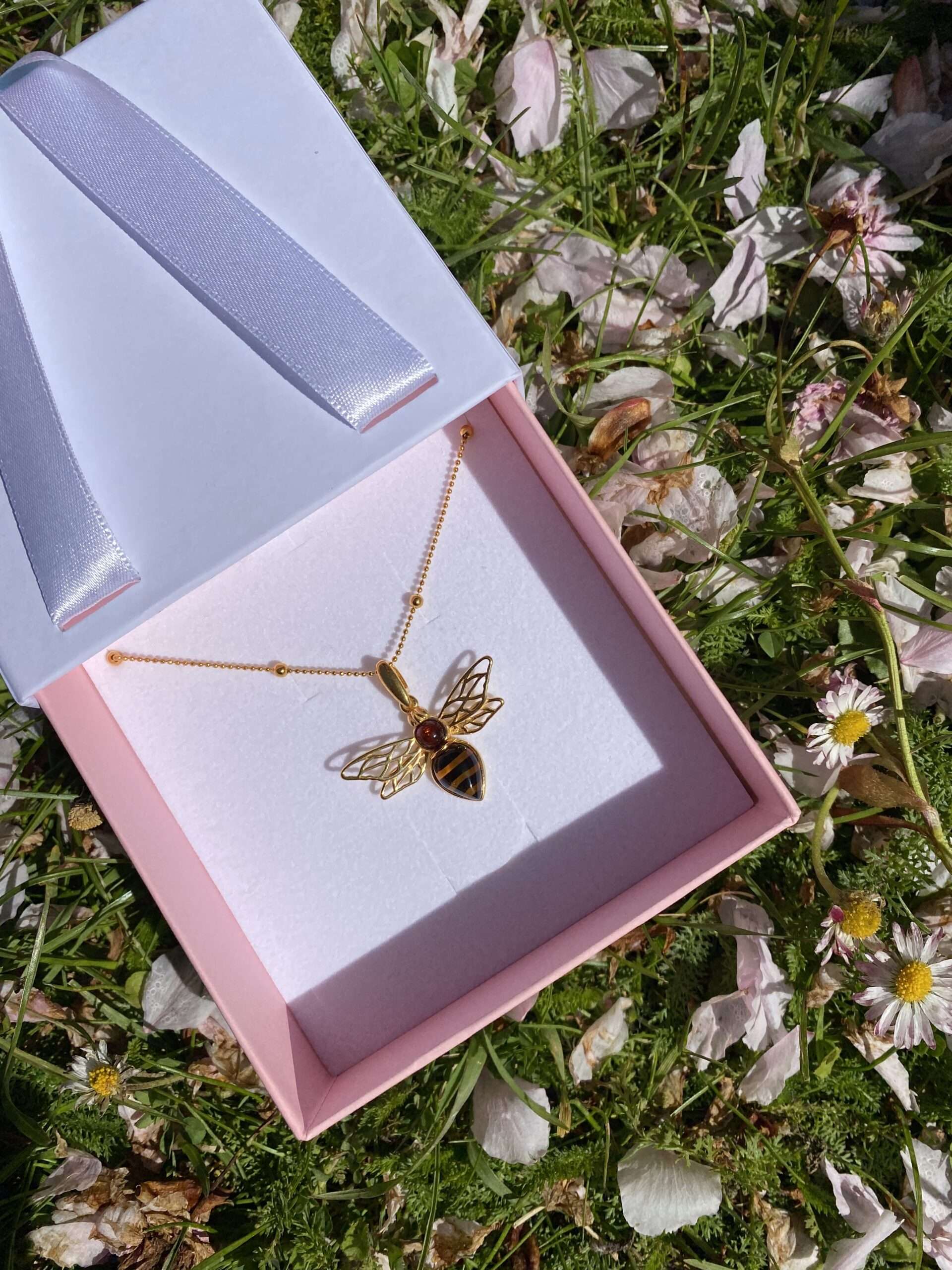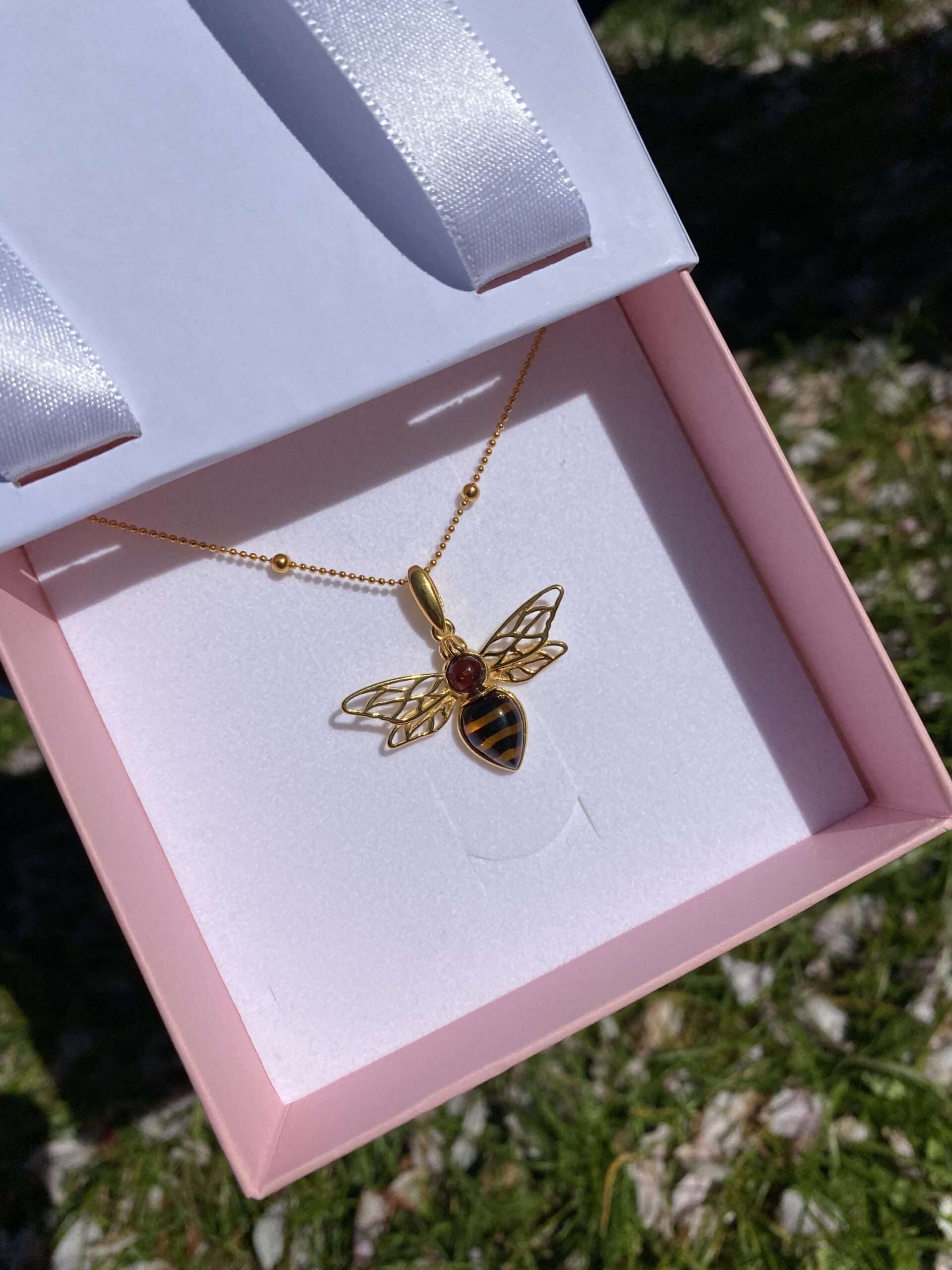 Naszyjnik w kształcie pszczoły z bursztynowym akcentem to piękny i unikalny dodatek do biżuterii, który przyciąga uwagę swoim urokiem i subtelnością.