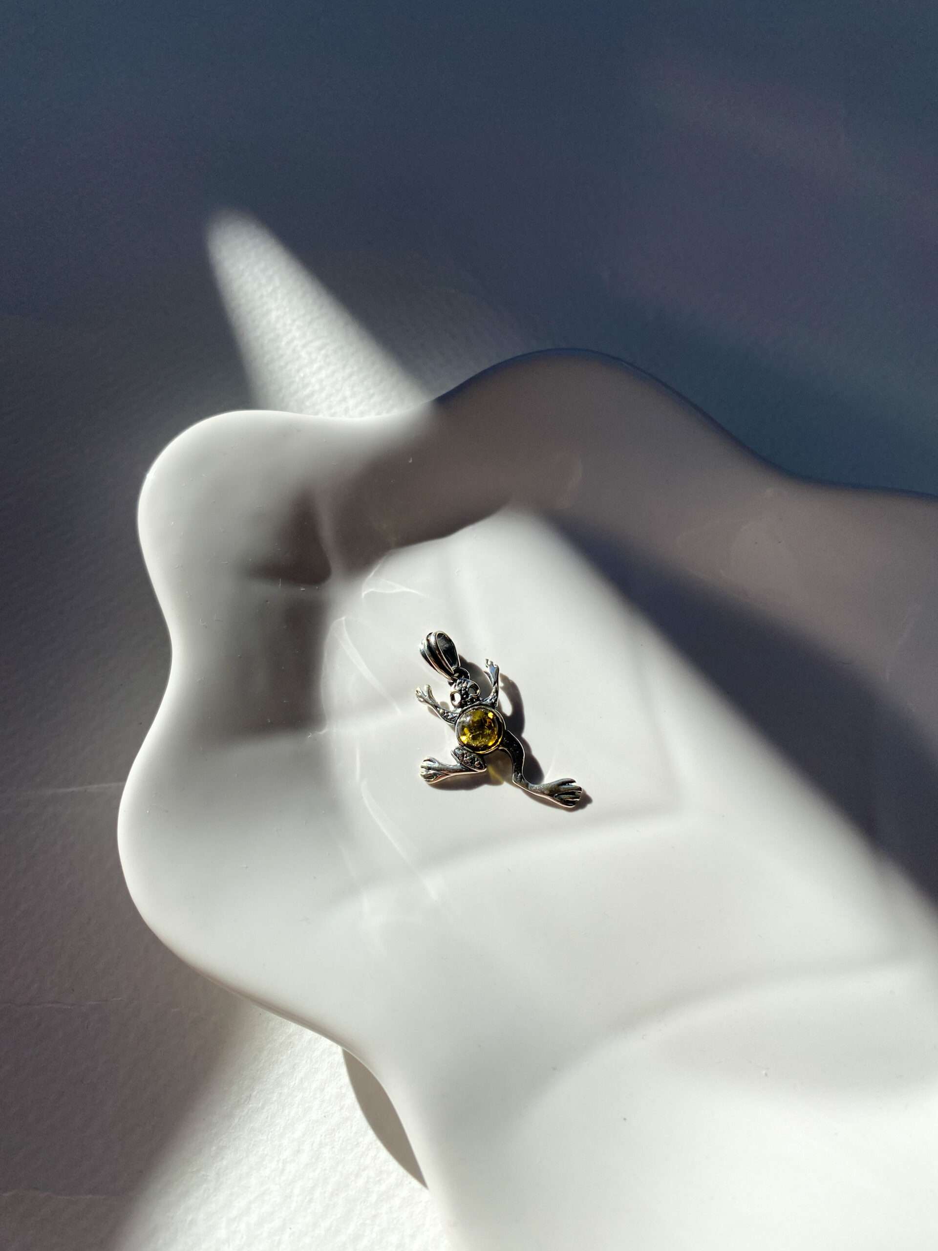 Delikatny wisiorek wykonany ze srebra próby 925, przedstawiający uroczą żabkę. Żabkę zdobi ciepły, zielony bursztyn, który nadaje całości naturalnego uroku. Srebrne detale, takie jak wyraziste oczy i łapki, podkreślają wyjątkowy charakter wisiorka. To subtelna ozdoba, która doda uroku każdej stylizacji.