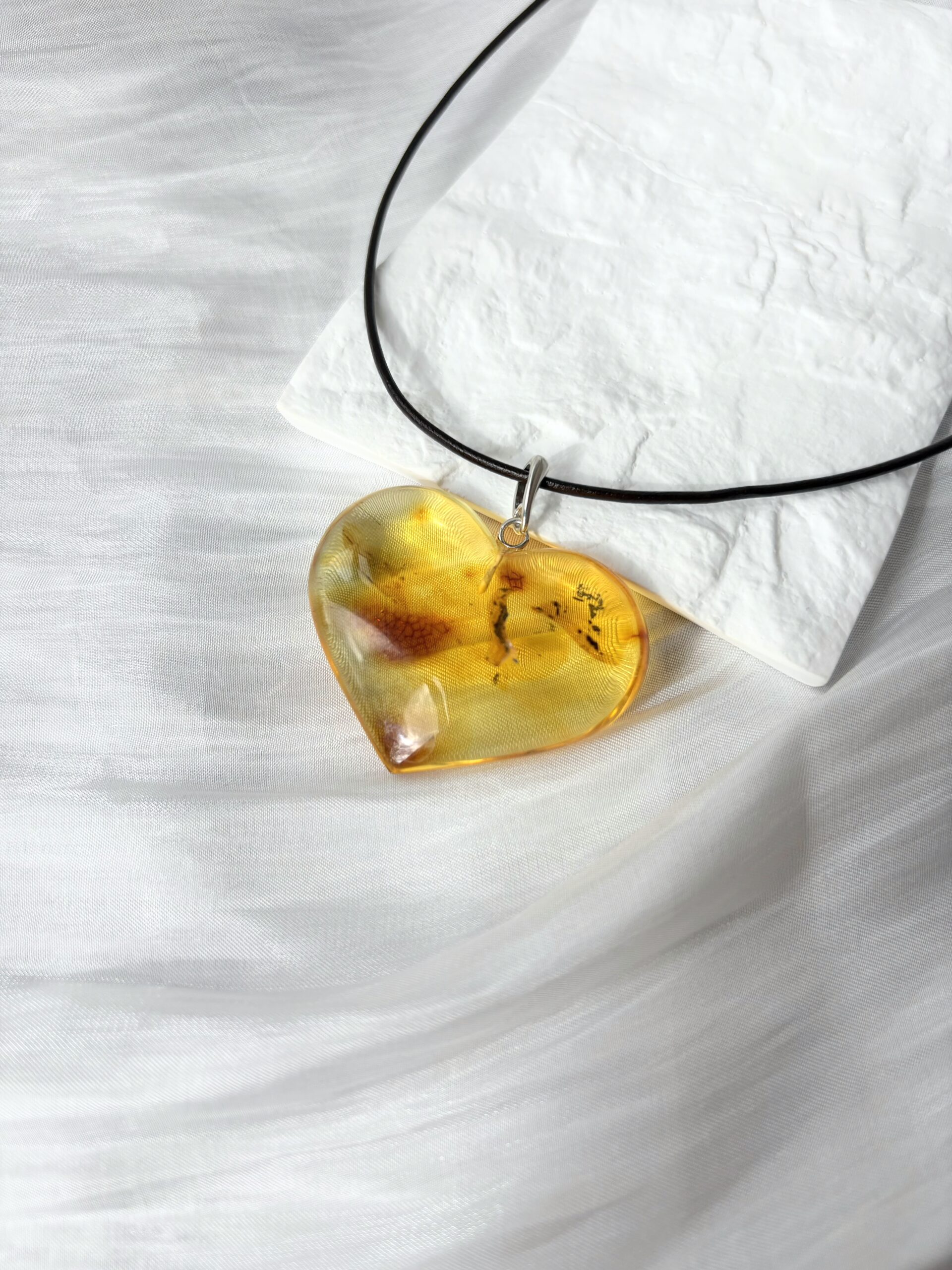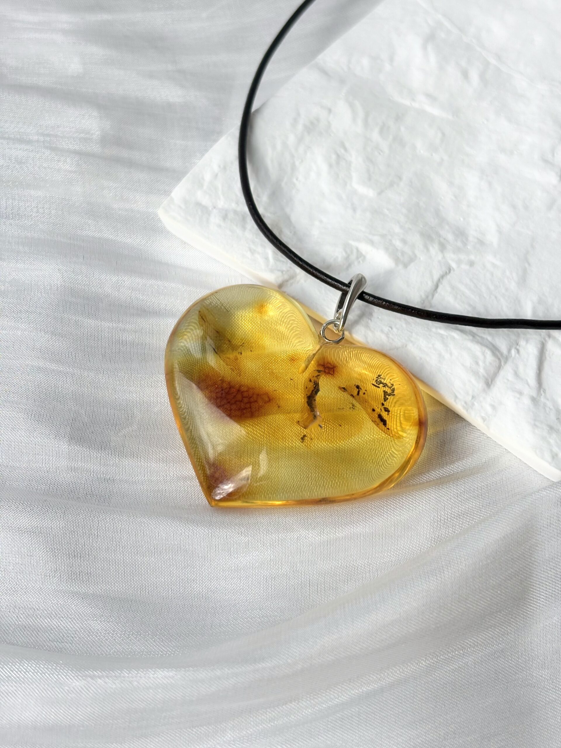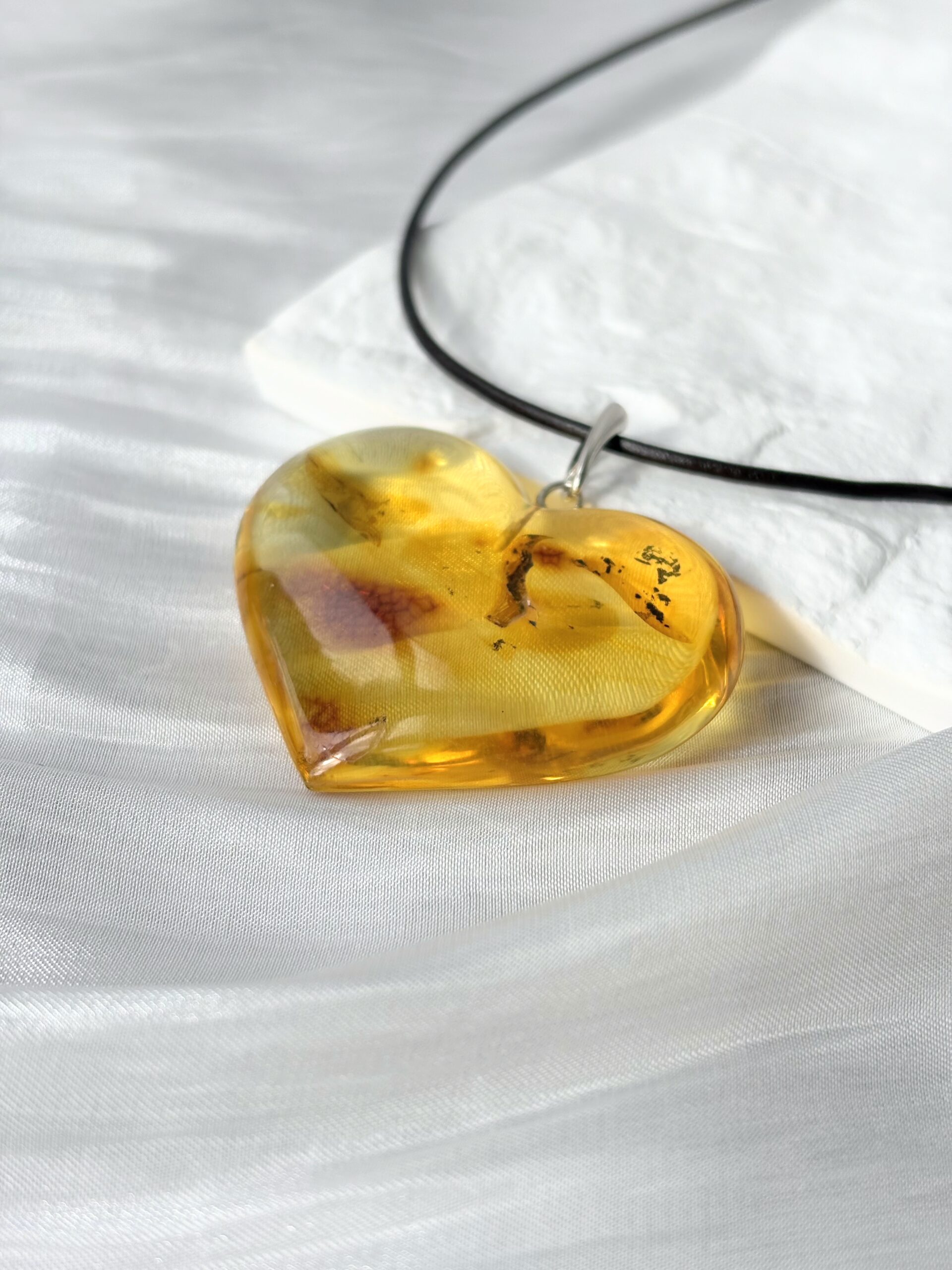 Piękny wisiorek z naturalnego bursztynu w kształcie większego serca. Kamień został oszlifowany, aby wydobyć jego blask.
